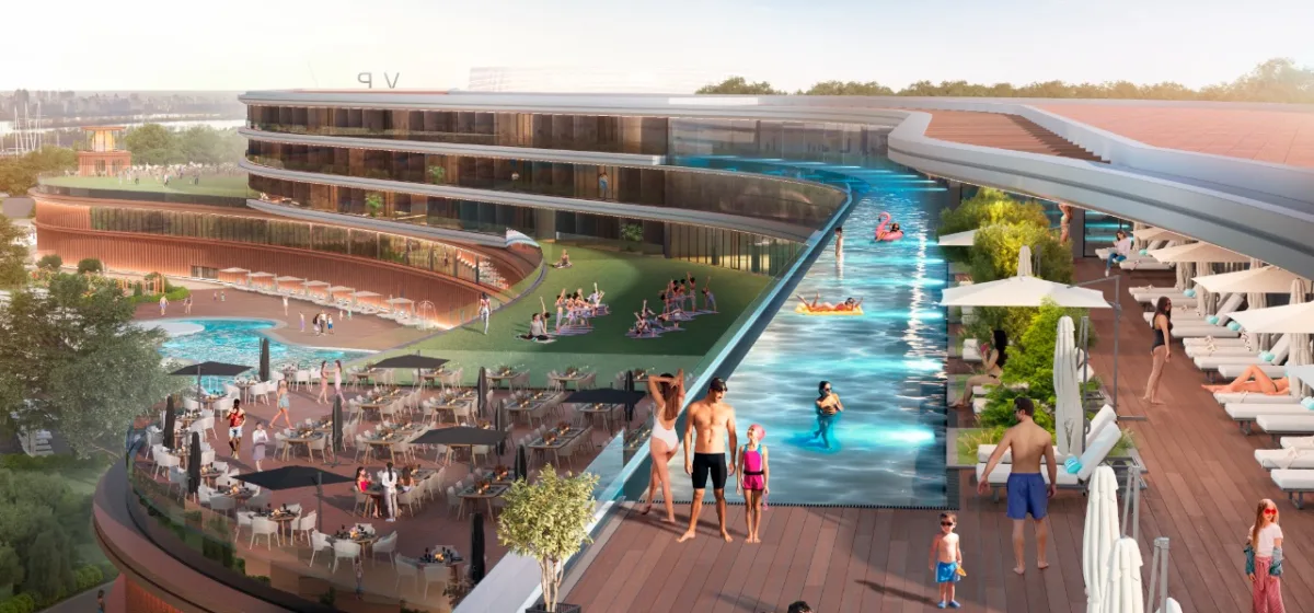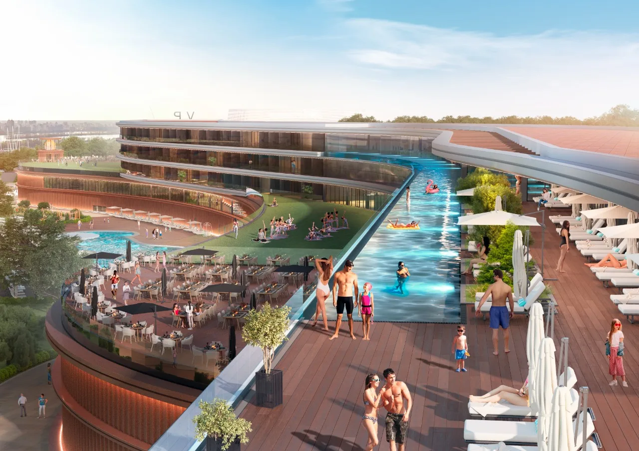 Згідно архітектурно-планувальних рішень, концепція передбачає зведення з нуля двох будівель, створення великої паркової зони та реалізацію причалів і парку на воді. В одній будівлі планується зведення арени (концертного залу), яхт-клубу та паркінгу, в іншій – готелю, казино, SPA-центру, нічного / пляжного клубу, театру кабаре, ресторанів, паркінгу та ін. В результаті реалізації проєкту утвориться сучасний квартал для відпочинку та розваг з атмосферою Лас-Вегаса, своєрідне «місто в місті». Загальна будівельна площа (GBA) проєкту становитиме біля 78 000 кв. м. Основними «якорями» проєкту стали: SPA-центр з унікальним для Києва та України панорамним басейном на верхньому поверсі основної будівлі, сучасна та високотехнологічна арена (концертний зал), казино та єдиний в Україні театр розваг і кабаре, яхт-клуб преміум-класу, нічний клуб з водоспадом, міський пляжно-прогулянковий пірс (взимку – ковзанка під відкритим небом), паркова зона, 180-градусний маяк ін.
